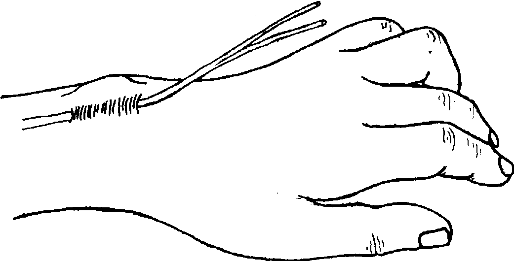 4.在桡骨掌侧做拇长屈肌的腱固定术。此组手术完成后,当腕关节主动背伸时,则拇长屈肌腱固定牵动拇指与示指桡侧对捏,拇指间关节被克氏针固定而防止屈曲,腕重力作用掌屈,从而使捏指张开。