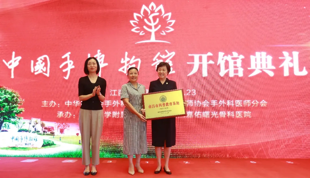 典礼仪式现场,南昌市政府龙国英副市长和南昌市科协邹玉萍主席向中国手博物馆授予“南昌市科普教育基地”。嘉佑医疗投资集团助力了中国手博物馆建设的实现并成为科普教育基地。特别是对老一辈医学工作者的敬业、钻研、探索精神由衷地敬佩,并为之传承和发扬。